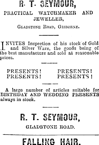 R. I- SEYMOUR, PRACTICAL WATCHMAKER AND JEWELLER, Gladstone Road, Gisborne. T NVITES Inspection of his stock of Gold 1 and Silver Ware, the goods being of the best manufacture and sold at reasonable prices. PRESENTS! PRESENTS! PRESENTS ! PRESENTS! A large number of articles suitable for BIRTHDAY AND WEDDING PRESENTS always in stock. FL T. SEYMOUR, GLADSTONE ROAD. FALLING HAIR