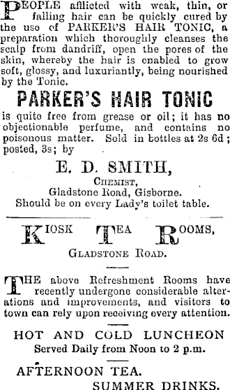 PEOPLE afflicted with weak, thin, or falling hair can be quickly cured by the use of PARSERS HAIR TONIC, a preparation which thoroughly cleanses the scalp from dandriff, open the pores of the skin, whereby the hair is enabled to grow soft, glossy, and luxuriantly, being nourished by the Tonic. PARKER’S HAIR TONIC is quite free from grease or oil; it has no objectionable perfume, and contains no poisonous matter. Sold in bottles at 2s 6d ; posted, 3s; by E. D. SMITH, Chemist, Gladstone Road, Gisborne. Should be on every Lady’s toilet table. jg'.IOSK rjTEA Jp>OOMS, Gladstone Road. rpHE above Eefreshment Rooms have -B. recently undergone considerable alterations and improvements, and visitors to town can rely upon receiving every attention. HOT AND COLD LUNCHEON Served Daily from Noon to 2 p.m. AFTERNOON TEA. SUMMER DRINKS.