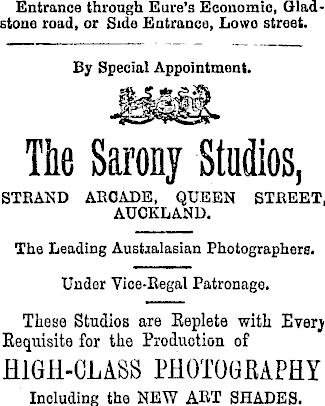 Entrance through Eure’s Economic, Gladstone road, or Side Entrance, Lowo street. By Special Appointment. The Sarony Studios, STBAND AKOADE, QUEEN STBEET, AUCKLAND. The Leading Australasian Photographers. Under Vice-Regal Patronage. These Studios are Replete with Every Requisite for the Production of HIGH-CLASS PHOTOGRAPHY Including the NEW ART SHADES.