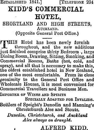 Established 1841.] [Telephone 204 KIDD’S COMMERCIAL HOTEL, SHOETLAND AND HIGH STEEETS, Auckland. (Opposite General Post Offioe.) THIS Hotel has been newly furnish throughout, and the new additions just finished comprise thirty Bedroom , large Dining Room, Drawing, Sitting, Smoking, and Commercial Booms, Baths (hot, cold, and spray), and all that is necessary to make this, the oldest established hotel in New Zealand, one of the most comfortable. From its close proximity to the General Post Office and Wholesale Houses, it is most convenient for Commercial Travellers and Business Men. Impobteb op Wines and Spibits Specially Adapted fob Invalids. Bottlers of Speight’s Dunedin and Manning’s Christchurch Ales and Stouts. Dunedin, Christchurch, and Auckland Ales always on draught. , ALFRED KIDD.