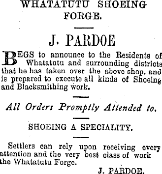 WHATATUTU SHOEING FOEGE. J. PAKDOE EEGS to announce to the Eesidents of Whatatutu and surrounding districts that he has taken over the above shop, and is prepared to execute all kinds of Shoeing and Blacksmithing work. All Orders Promptly Attended to. SHOEING A SPECIALITY. Settlers can rely upon receiving every attention and the very best class of work the Whatatutu Forge. J. PAEDOE.