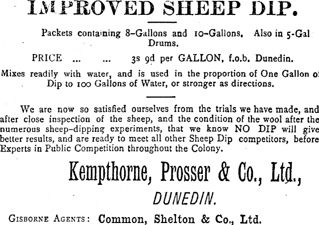 lAI PILOTED SHEEP DIP. Packets containing 8-Gallons and io-Gallons. Also in 5-Gal Drums. PRICE ... ... 3s 9d per GALLON, f.o.b. Dunedin. Mixes readily with water, and is used in the proportion of One Gallon of Dip to 100 Gallons of Water, or stronger as directions. We are now so satisfied ourselves from the trials we have made, and after close inspection of the sheep, and the condition of the wool after the numerous sheep-dipping experiments, that we know NO DIP will give better results, and are ready to meet all other Sheep Dip competitors, before Experts in Public Competition throughout the Colony. Kemptliorne, Prosser & Co., Ltd., DUNEDIN . Gisborne Agents : Common, Shelton & Co., Ltd.