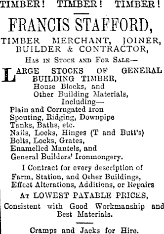 TIMBER! TIMBER ! TIMBER ! FRANCIS STAFFORD, TIMBER MERCHANT, JOINER, BUILDER & CONTRACTOR, Has in Stock and For Sale—f ARGE STOCKS OF GENERAL. U BUILDING TIMBER, House Blocks, and Other Building Materials, Including— Plain and Corrugated iron Spouting, Ridging, Dowupipo Tanks, Baths, etc. Nails, Locks, Hinges (T and Butt’s) Bolts, Locks, Grates, Enamelled Mantels, and General Builders' Ironmongery. I Contract for every description of Farm, Station, and Other Buildings, Effect Alterations, Additions, or Repairs At LOWEST PAYABLE PRICES, Consistent with Good Workmanship and Best Materials. Cramps and Jacks for Hire.