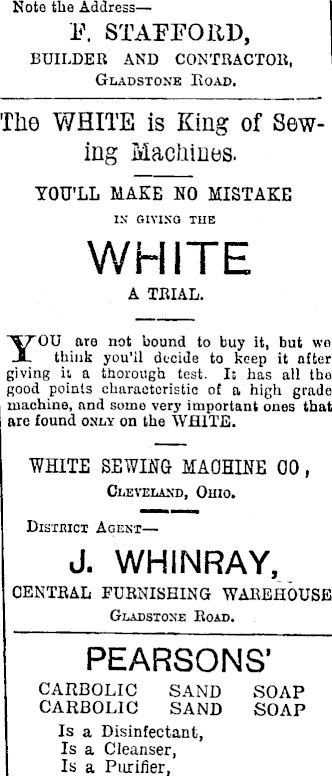 Note tho Address—--3?. STAFFORD, BUILDER AND CONTRACTOR, Gladstone Road. The WHITE is King of Sewing Machines. YOU'LL MAKE NO MISTAKE IS GIVING THE WHITE A TRIAL. YOU are not bound to buy it, but wo think you’il decide to keep it after giving it a thorough test. Is has all tho good points characteristic of a high grade machine, and some very important ones that are found only on the WHITE. WHITE SEWING MACHINE 00 , Cleveland, Ohio. Disteict Agent— J. WHINRAY, CENTRAL FURNISHING WAREHOUSE, Gladstone Road. PEARSONS' CARBOLIC SAND SOAP CARBOLIC SAND SOAP Is a Disinfectant, Is a Cleanser, Is a Purifier,