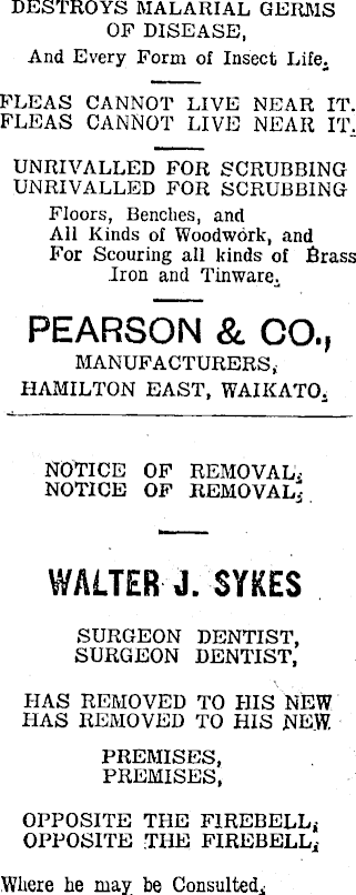 DESTROYS MALARIAL GERMS OF DISEASE, And Every Form of Insect Life. FLEAS CANNOT LIVE NEAR IT. FLEAS CANNOT LIVE NEAR IT, UNRIVALLED FOR SCRUBBING UNRIVALLED FOR SCRUBBING Floors, Benches, and All Kinds of Woodwork, and For Scouring all kinds of Brass Iron and Tinware. PEARSON & CO., MANUFACTURERS < HAMILTON EAST, WAIKATO, NOTICE OF REMOVAL.NOTICE OF REMOVAL,WALTER J. SYKES SURGEON DENTIST, SURGEON DENTIST, HAS REMOVED TO HIS NEW HAS REMOVED TO HIS NEW PREMISES, PREMISES, OPPOSITE THE FIREBELL,OPPOSITE THE FIREBELL, Where he may be Consulted;
