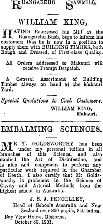 UANGAREHU lAWMILL. WILLIAM KING, HAVING Ro-ereoted his Mill* at the Ruangarehu Bush, begs to inform his customers that he is now in a position to supply them with BUILDING TIMBER, both Rough and Dressed, of First-class Quality. All Orders addressed to Makauri will receive Prompt Despatoh. A General Assortment of Building Timber alwayß ■on hand at the Makauri Yard. Special Quotations to Cash Customers. WILLIAM KING, Makauri. EMBALMING SCIENCES. MR T. GOLDSWORTHY has been under my personal tuition in all branches of this Science, and also studied the Art of Disinfection, and is able and competent to perform any particular work required in the Chamber of Death. I also certify that Mr Goldsworthy is proficient in the Soienco of Cavity and Arterial Methods from the highest school in Australia. J. S. J. PENGELLEY, Head of Schools Australia and New Zealand over 800 pupils, 340 ladies. Bay Viow House, Gisborne, October 30,1901.