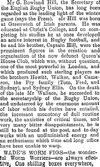 Mr 6. Rowland Hill, the Secretary of the English Rugby Union, has long been regarded as the leading light of the winter game (says the Press). Mr Hill was born at Greenwich of Irish parents. He was educated at Christ’s College, and on completing his studies he at once developed an active interest in Rugby football, and he and his brother, Captain Hill, were the prominent figures in the creation and organisation of the now defunct Queen’s House Club, which was, without question, one of the most powerful in London, and which produced such sterling players as the brothers Hewitt, Walker, and Cameron, the Fry family (Tom, Fred, and Sydney), and Sydney Ellis. On the death of the late Mr Wallace, he succeeded to the secretaryship of the Rugby Union, and undeterred by the enormous arnouDt of labor which his duties have entailed, the incessant monotony of dull routine work, the anxieties of critical times, and very many bitter disappointments, he is still to be found at the post, and to-day works with an undiminished energy and an enthusiasm which time and long office have been unable to warp. WADE’S WORM FlGS—the wonderful Worm Worriers—are always effective, One shilling hoses everywhere,