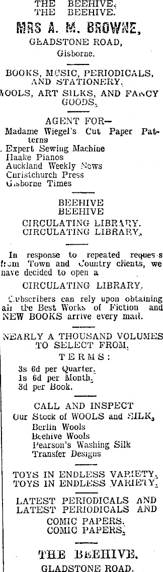 THE BEEHIVE, THE BEEHIVE. KIRS A. M, BRQY/ME, GLADSTONE ROAD, Gisborne. BOOKS, MUSIC, PERIODICALS, AND STATIONERY. WOOLS, ART SILKS, AND FAisCY GOODS. AGENT FORMadame Wiegel’s Cut Paper Patterns . Expert Sewing Machine Ilaake Pianos Auckland Weekly News Cnristchurch Press G.sborne Times BEEHIVE BEEHIVE CIRCULATING LIBRARY'. CIRCULATING LIBRARY, In response to repeated reques s f:em Town and Country clients, we nave decided to open a CIRCULATING LIBRARY. 'Subscribers can rely upon obtaining au tie Best Works of Fiction and NEW BOOKS arrive every mail. NEARLY A THOUSAND VOLUMES TO SELECT FROM. TER M S : 3s 6d per (Quarter. Is Gd per Month. 3d per Book. CALL AND INSPECT Our Stock of WOOLS and SILK a Berlin Wools Beehive Wools Pearson’s Washing Silk Transfer Designs TOYS IN ENDLESS VARIETY, TOYS IN ENDLESS VAKIE't Y, LATEST PERIODICALS AND LATEST PERIODICALS AND COMIC PAPERS. COMIC PAPERS., the beeiilve. GLADSTONE ROAD.
