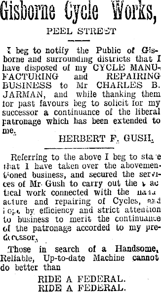 Gisborne Cycle forks, PEEL STREET I beg to notify the Public of Gisborne and surrounding districts that I have disposed of my CYCLE MANUFACTURING and REPAIRING BUSINESS to Mr CHARLES B. JARMAN, and while thanking them lor past favours beg to solicit for my successor a continuance of the liberal patronage which has been extended to me. HERBERT F, GUSH. Referring to the above I beg to sta e that I have taken over the abovemenUoned business, and secured the services of Mr Gush to carry out the v ao tical work connected with the mam acture and repairing of Cycles, ar-d i opi, by. efficiency and strict attention to business to merit the continuance of the patronage accorded to my predi ctssor, .Those in search ol a Handsome, Reliable, Up-to-date Machine cannot do better than RIDE A FEDERAL. RIDE A FEDERAL.