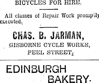 BICYCLES FOR HIRE. All classes of Repair Work promptly executed. ohas. b. mm®, GISBORNE CYCLE WORKS, PEEL STREET.; EDINBURGH BAKERY-
