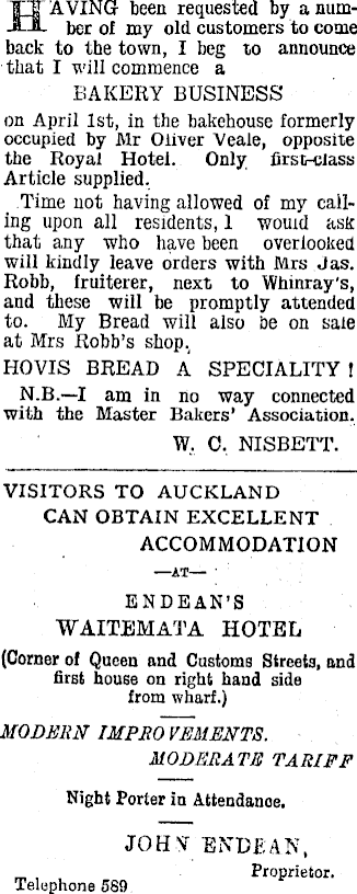 AVING teen requested by a num-j£-*L ber of my old customers to come back to the town, I beg to announce that I will commence a BAKERY BUSINESS' on April Ist, in the bakehouse formerly occupied by Mr Oliver Veaie, opposite the Royal Hotel. Only first-class Article supplied. Time not having allowed of my calling upon all residents, 1 would ask that any who have been overlooked will kindly leave orders with Mrs Jas. Robb, fruiterer, next to Whinray's, and these will be promptly attended to. My Bread will also be on sale at Mrs Robb’s shop. HOVIS BREAD A SPECIALITY f N. B.—l am in no way connected with the Master Bakers’ Association. W, C. NISBETT. VISITORS TO AUCKLAND CAN OBTAIN EXCELLENT ACCOMMODATION —AT—ENDEAN’S WAITEMATA HOTEL (Corner of Queen and Customs Streets, and first house on right hand side from wharf.) MODERN IMPRO VEMENTS. MODERATE TARIFF Night Porter in Attendance. JOHN ENDBAN, Telephone 580 Proprietor.