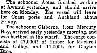 The schooner Aotea finished working at Awanui yesterday, and should arrive here on Monday. The vessel will leave for Coast ports and Auckland about Friday. The schooner Gisborne, from Mercury Bay, arrived early yesterday morning, and was berthed at the wharf. Tho cargo consists of 47,000 ft of timber for Mackrell and Colley, and 11,000 ft for Clayton Bros.