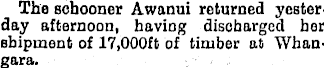 The schooner Awanui returned yesterday afternoon, having discharged her shipment of 17,000 ft of timber at Whangara.