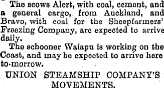The scows Alert, with coal, ccmont, and a general cargo, from Auckland, and Bravo, with coal for the Sheepfarmers’ Freezing Company, are expected to arrive daily. The schooner Waiapu is working on the Coast, and may be expected to arrive here to-morrow. UNION STEAMSHIP COMPANY'S MOVEMENTS.