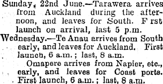 Sunday t 22nd June.—Tarawera arrives from Auckland during the afternoon, and leaves for South. F rst launch on arrival, last 5 p.m. Wednesday.—Te Anau arrives from South early, and leaves for Auckland. First launch, 6 a.m.; last, 8 a.m. Omapere arrives from Napier, etc., early, and leaves for Coast ports. First launch, 6 a.m.; last, 8 a.m.