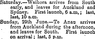Saturday.—Waihora arrives from South early, and leaves for Auckland and Sydney. First launch, 6 a.m,; last, last, 10 a.m. Sunday, 29th June.—Te Anau arrives from Auckland during the afternoon, and leaves for South. First launch on arrival; last, 5 p.m.