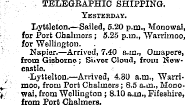 TELEGRAPHIC SHIPPING. Yesterday. Lyttleton.—Sailed, 5.20 p.m., Monowai, for Port Chalmers ; 5.25 p.m., Warrimoo, for Wellington. Napier.—Arrived, 7.40 a.m., Omapere, from Gisborne ; Silver Cloud, from Newcastle. Lyttelton.—Arrived, 4.30 a.m., Warrimoo, from Port Chalmers ; 8.5 a.m., Monoj. wai, from Wellington ; 8.10 a.m., Fifeshire, from Port Chalmers.