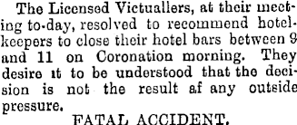 Tho Licensed Victuallers, at their meeting to-day, resolved to reeommond hotelkeepers to close their hotel bars between 9 and 11 on Coronation morning. They desire it to be understood that tho decision is not the result af any outside pressure. FATAL ACCIDENT.