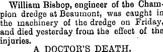 William Bishop, engineer of the Champion dredge at Beaumont, was caught in tho machinery' of the dredge on Friday, and died yesterday from the effect of the injuries. A DOCTOR’S DEATH.