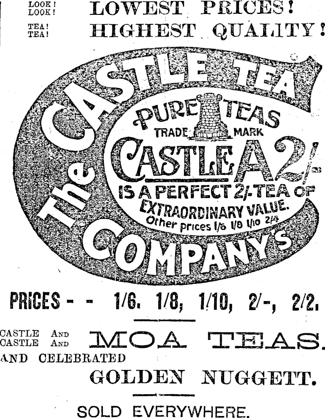 LOOK f LOOK! TEA! TEA! LOWEST PRICES! HIGHEST QUALITY! mss TKMIJBM-mRK ©stlea 7 £ IS A PERFECT2/-TEA. Offprices 1/6 VS » PRICES - - 1/6. 1/8, 1/10, 2/-, 2/2. CASTLE And ZMIO.A- TEAS. AND CELEBRATED GOLDEN NUGGETT. SOLD EVERYWHERE.