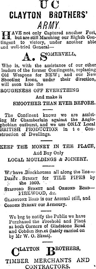XJC CLAYTON BROTHERS’ ARMY HAVE not only Captured another Fort, but are still Marching our Eighth Contingent to victory, under another able and well-tried General— A. 8 OMERVELL, Who is, with the assistance of our other leaders of the former Contingents, replaoing Old Weapons for NEW; and our New Shooting Irons, under their direction, will soon take the ROUGHNESS OFF EVERYTHING And make it SMOOTHER THAN EVER BEFORE. The Continent knows we are assisting Mr Chamberlain against the Anglophobian outburst, and we use ONLY Local BRITISH PRODUCTION in t e Construction of Dwellings. KEEP THE MONEY IN THE PLACE, And Buy Only LOCAL MOULDINGS & JOINERY. Wh'have Tlloekhouses all along the line DerjSv Street for TILE PIPES by the 1000. Stafford Street and Ormond Road— FIREWOOD, &o. Gladstone Hoad is our Arsenal still, and Cobden Street our Armoury. W 7 e beg to notify the Public we have Purchased the Freehold and Plant at both Corners of Gladstone Road and Cobden Street (lately carried on by Mr W. 0. Skeet). c LAYTON JJROTHERS, TIMBER MERCHANTS AND CONTRACTORS.