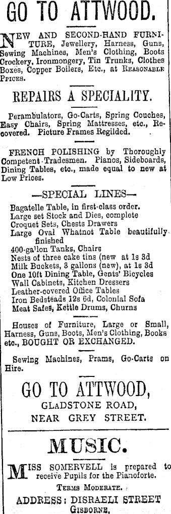 GO TO ATTWOOD. -wjEW AND SECOND-HAND FURMJjvl TUBE, Jewellery, Harness, Guns, Sewing Machines, Men’s Clothing, Boots Crockery, Ironmongery, Tin Trunks, Clothes Boxes, Copper Boilers, Eta., at Reasonable PrioEs. REPAIRS ASPECIALITL Perambulators, Go-Carts, Spring Couches, Easy Chairs, Spring Mattresses, etc., Recovered. Pioture Frames Regilded. FRENCH POLISHING by Thoroughly Competent Tradesmen. Pianos, Sideboards, Dining Tables, etc., made equal to new at Low Prioes. —SPECIAL LINES— Bagatelle Table, in first-class order. Large set Stock and Dies, complete Croquet Sets, Chests Drawers Large Oval Whatnot Table beautifully finished 400-ga’lon Tanks, Chairs Nests of three cake tins (new at Is 3d Milk Buokets, 3 gallons (new), at Is 3d Ona 10ft Dining Table, Gents' Bicycles Wall Cabinets, Kitchen Dressers Leather-oovered Office Tables Iron Bedsteads 12s 6d, Colonial Sofa Meat Safes, Kettle Drums, Churns Houses of Furniture, Large or Small, Harness, Guns, Boots, Men’s Clothing, Books eto., BOUGHT OR EXCHANGED. Sewing Machines, Prams, Go-Carts on Hire. GO TO ATTWOOD, GLADSTONE ROAD, NEAR GREY STREET. MUSIC. MISS SOMERVELL is prepared to receive Pupils for the Pianoforte. Tebhs Moderate. ADDRESS i DISRAELI STREET Gisborne,