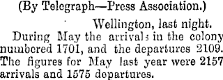 (By Telegraph—Press Association.) Wellington, last night. During May the arrivals in the colony numbered 1701, and the departures 2109. The figures for May last year were 2157 arrivals and 1575 departures.