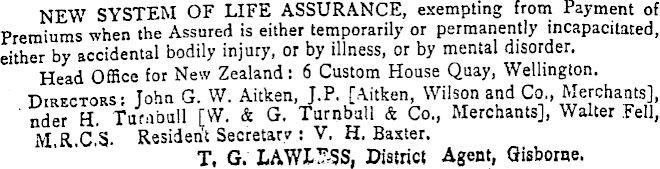 NEW SYSTEM OF LIFE ASSURANCE, exempting from Payment of Premiums when the Assured is either temporarily or permanently incapacitated, either by accidental bodily injury, or by illness, or by mental disorder. Head Office for New Zealand: 6 Custom House Quay, Wellington. •DrRFCTORS- John G. W. Aitken, J.P. [Aitken, Wilson and Co., Merchants], nder H. Turnbull [W. & G. Turnbull & Co., Merchants], Walter Fell, M R C.S. Resident Secretary :V. H. Baxter. T. G. LAWLESS, District Agent, Gisborne.