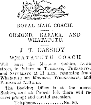 ROYAL MAIL COACH. ORMOND, KARAKA, AND WHATATUTU. J T. CASSIDY w;n A T ATOT TJ COA C H Will Lave the Aiv..ui,;c btahies, Lowe street, in future on Tuesdays, Thdhkdayh, and Satubuays at 11 a.m., returnin'' from Wliatatuiu on Mondays, Wednesdays, and Fiudays at 7.30 a in. The Looking Of lice is at the above Stables, and ah Parcel:, loft there will receive prompt and careful attention. Telephone No. 80.