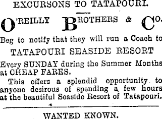 EXCURSONS TO TATAPOURI. o 'REILLY JgROTHERS & c°Beg to notify that they will run a Coach to TATAPOURI SEASIDE RESORT Every SUNDAY during the Summer Months at CHEAP FARES. This oilers a splendid opportunity to anyone desirous of spending a few hours at the beautiful Seaside Resort of Tatapouri. WANTED KNOWN.