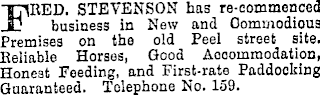 FRED. STEVENSON has re-commenced business in New and Commodious Premises on the old Peel street site. Reliable Horses, Good Accommodation, Honest Feeding, and First-rate Paddocking Guaranteed. Telephone No. 159.