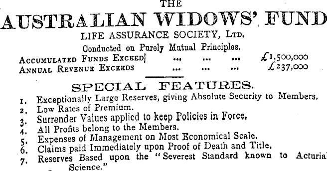 THE AUSTRALIAN WIDOWS’ FUND LIFE ASSURANCE SOCIETY, Ltd. Conducted on Purely Mutual Principles. Accumulated Funds Exceed! ... ... ... £1,500,000 Annual Revenue Exceeds A. 237,000 SPECIAL FEATURES. 1. Exceptionally Large Reserves, giving Absolute Security to Members. 2 Low Rates of Premium. 3.’ Surrender Values applied to keep Policies in Force, 4 All Profits belong to the Members. c' Expenses of Management on Most Economical Scale. 6. Claims paid Immediately upon Proof of Death and Title. 7' Reserves Based upon the “ Severest Standard known to Acturial Science."