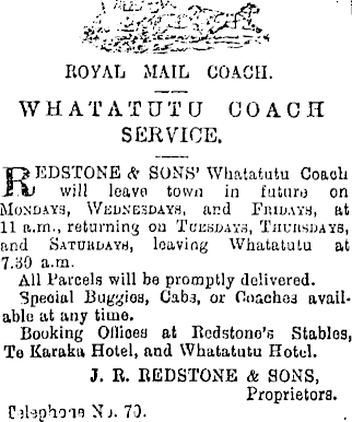KOVAL MAIL COACH. WH AT ATUTQ 00 A 0 H SERVICE. 3EDSTONE& SONS’Whatatutu Coach B\i will leave town in f utnro on Mondays, Wednesdays, and Fridays, at 11 a.rn., returning on Tuesdays, Thursdays, and Saturdays, leaving Whatatutu at 7.80 a.rn. All Parcels will be promptly delivered. Special Buggios, Cabs, or Coaches available at any time. Booking Ollioes at Redstone’s Stables, Te Karaka Hotel, and Whatatutu Hotel. 3. R. REDSTONE & SONS, Proprietors. C daphne N j. 70.