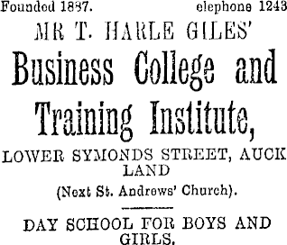 Founded 1847. elephona 1243 MR T. HA RLE GILES' Business College and Training Institute, LOWER SYMONDS STREET, AUCKLAND (Next St. Andrews’ Church). DAY SCHOOL FOR BOYS AND GIRLS.