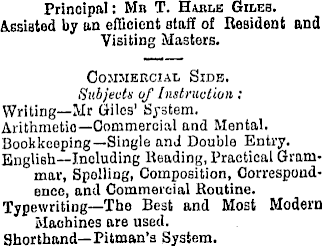 Principal: Mn T. Harle Giles. Assisted by an eilicient staff of Resident and Visiting Masters. Commercial Side. Subjects of Instruction: Writing—Mr Giles’ System. Arithmetic—Commercial and Mental. Bookkeeping—Single and Double Entry. English—lncluding Reading, Practical Grammar, Spelling, Composition, Correspondence, and Commercial Routine. Typewriting—The Best and Most Modern Machines are used. Shorthand—Pitman’s System.
