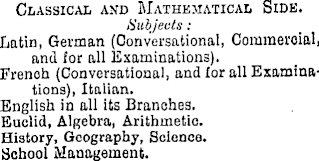 Classical and Mathematical Side. /Subjects: Latin, German (Conversational, Commercial, and lor all Examinations). French (Conversational, and lor all Examinations), Italian. English in all its Branches. Euclid, Algebra, Arithmetic. History, Geography, Science. School Management.