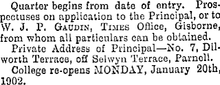 Quarter begins from date of entry. Prospectuses on application to the Principal, or to \V. J. P. Gaudin, Times Office, Gisborne, from whom all particulars can be obtained. Private Address of Principal—No. 7, Dilworth Terrace, off Sehvyn Terrace, Parnell. College re-opens MONDAY, January 20th, 1902.