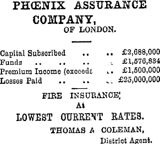 PHCENXX ASSURANCE COMPANY, OF LONDON. Capital Subscribed .. Funds Premium Inoome (exocede Losses Paid £2,688,000 £1,570,834 £1,500,000 £25,000,000 fire insurance; At LOWEST CURRENT RATES. THOMAS A COLEMAN, District Agent.