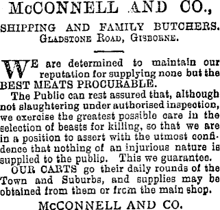 McConnell and co., SHIPPING AND FAMILY BUTCHERS. Gladstone Road, Gisborne. WE aro determined to maintain our reputation for supplying none but the BEST MEATS PROCURABLE. The Publio can re3t assured that, although not slaughtering under authorised inspection, we exercise the greatest possible oare in the selection of beasts for killing, so that we are in a position to assert with the utmost confidence that nothing of an injurious nature is supplied to the publio. This we guarantee. OUR CARTS go their daily rounds of the Town and Suburbs, and supplies may be obtained lrom them or from the main Bhop. McConnell and co.