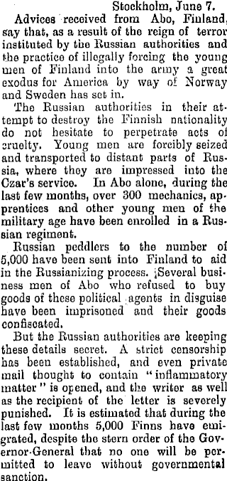 Stockholm, June 7. Advices received from Abo, Finland, say that, as a result of the reign of terror instituted by the Russian authorities and the practico of illegally forcing the young men of Finland into the army a great exodus for America by way of Norway and Sweden has sot in. Tho Russian authorities in their attempt to destroy the Finnish nationality do not hesitate to perpetrate acts of cruelty. Young men are forcibly seized and transported to distant parts of Russia, where they are impressed into the Czar’s service. In Abo alone, during the last few months, over 300 mechanics, apprentices and other young men of the military age have been enrolled in a Russian regiment. Russian peddlers to the number of 5,000 have been sent into Finland to aid in the Russianizing process. business men of Abo who refused to buy goods of these political agents in disguise have been imprisoned and their goods confiscated. But the Russian authorities are keeping these details secret. A btrict censorship has been established, and even private mail thought to contain “ inflammatory matter ” is opened, and the writer as well as the recipient of the letter is severely, punished. It is estimated that during the last few months 5,000 Finns have emigrated, despite tho stem order of the Gov-ernor-General that no one will be permitted to leave without governmental sanction.