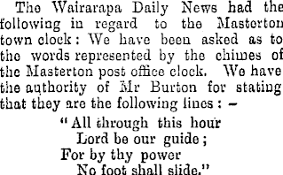 Tho Wairarapa Daily News had the following in regard to the Mastorton town clock : We have been asked as to tho words represented by the chimes of the Masterton post office clock. Wo have tho authority of Mr Burton for stating that they are the following linos : - “ All through this hour Lord be our guide ; For by thy power No foot shall slide."