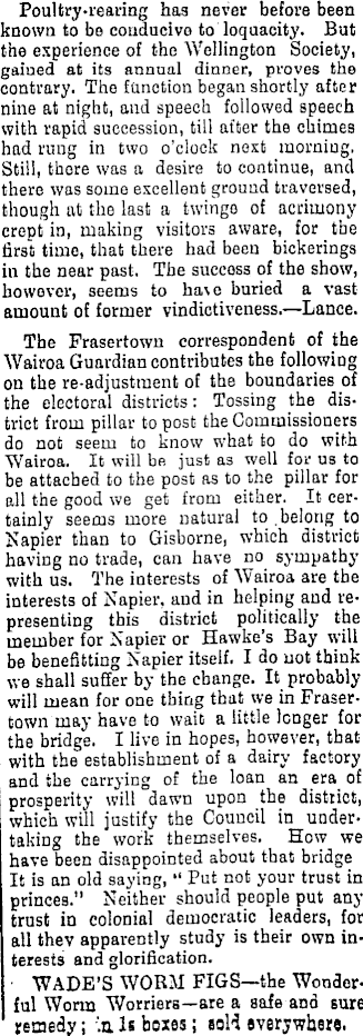 Poultry-rearing has never before been known to be conducive to loquacity. But the experience of the Wellington Society, gained at its annual dinner, proves the contrary. The function began shortly after nine at night, and speech followed speech with rapid succession, till after the chimes had rung in two o’clock next morning. Still, there was a desire to continue, and there was some excellent ground traversed, though at the last a twinge of acrimony crept in, making visitors aware, for the first time, that there had been bickerings in the near past. The succoss of the show, howover, seems to have buried a vast amount of former vindictiveness. —Lance. The Frasertown correspondent of the Wairoa Guardian contributes the following on the re-adjustment of the boundaries of the electoral districts: Tossing the district from pillar to post the Commissioners do not seem to know what to do with Wairoa. It will be just as well for us to be attached to the post as to the pillar for all the good we get from either. It certainly seems more natural to belong to Napier than to Gisborne, which district having no trade, can have no sympathy with us. The interests of Wairoa are the interests of Napier, and in helping and representing this district politically the member for Napier or Hawke’s Bay will be benefitting Napier itself. I do not think we shall suffer by the change. It probably will mean for one thing that we in Frasertown may have to wait a little longer for the bridge. I live in hopes, however, that with the establishment of a dairy factory and the carrying of the loan an era of prosperity will dawn upon the district, which will justify the Council in undertaking the work themselves. How we have been disappointed about that bridge It is an old saying, “ Put not your trust in princes." Neither should people put any trust in colonial democratic leaders, for all thev apparently study is their own interests and glorification. WADE'S WORM FlGS—the Wonderful Worm Worriers—are a safe and sure remedy; '.a Is boxes; sold everywhere.