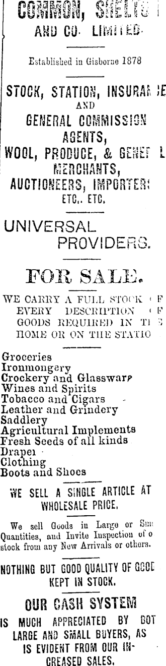 Established in Gisborno 1878 STOCK, STATION, INSURAr )E AND GENERAL COMMISSION AGENTS, WOOL, PRODUCE, & GENEF L MERCHANTS, AUCTIONEERS, IMPORTER! ETC, ETC. UNIVERSAL PROVIDERS. FOE, SALE. WE CARRY A FULL STO< K ' F EVERY DESCRIPTION ' F GOODS REQUIRED IN T 1 d HOME OR ON THE STATIC Groceries Ironmongery Crockery and Glasswarp Wines and Spirits Tobacco and Cigars Leather and Grindery Saddlery Agricultural Implements Fresh Seeds of all kinds Drapei Clothing Boots and Shoes WE SELL A SINGLE ARTICLE AT WHOLESALE PRICE. We sell Goods iu Largo or Suit Quantities, and Invite Inspection of o stock from any Now Arrivals or others. NOTHING BUT GOOD QUALITY OF GSOL KEPT IN STOCK. OUR GASH SYSTEM IS MUCH APPRECIATED BY DOT LARGE AND SMALL BUYERS, AS IS EVIDENT FROM OUR INCREASED SALES.