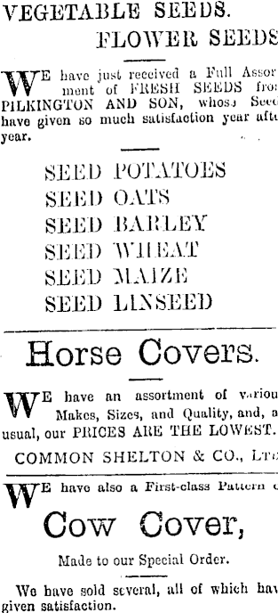 VEGETABLE SEEDS. ELOWER SEEDS WE have just received a Full Assor niont of l'KEbil SEEDb fro; PILKINGTON AND bON, whosj ben have givon so much satisfaction year ufti year. SEED POTATOES SEED OATS SEED HADLEY SEED All HAT SEED MAIZE SEED LI E SEED Horse Covers. WE have an assortment of v-niou Makes, Sizes, and Quality, and, a usual, our PIiICES AKE THE LOWEST. COMMON SHELTON & CO., Ltd have also a First-class Pattern c Cow Cover, Made to our Special Order. Wg have sold several, all of which given satisfaction.