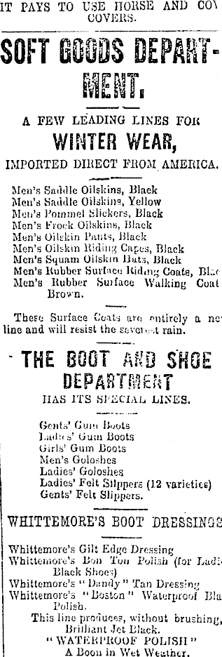 IT PAYS TO USE HOUSE AND CO 1 ! COVERS. SOFT 00! iEIT. A FEW LEADING LINES FOR WINTER WEAR, IMPORTED DIRECT FROM AMERICA. Men’s Saddle Oilskins, Black Men’s Saddle Oilskins, Yellow Men’s Pommel Slickers, Black Men’s Frock Oilskins, Black Men's Oilskin Pants, Black Men’s Oilskin Riding Capes, Black Men’s Squarn Oilskin lints, Black Men’s Rubber Surface Riding Coute, 81..< Men’s Rubber Suifuce Walking Coat Brown. There Surface Coats are entirely a no line and will resist the sever,,-,t rain. ■ THE BOOT ARC SHOE DEPABTiaikT HAS ITS SPECIAL, LINES. Gents’ Gum Boots I.mlu s' Uuiu Boots Girls’ Gum Boots Men’s Goloshes Ladies’ Goloshes Ladies’ Felt Slippers (12 varieties) Gents’ Felt Slippers. WHITTEMORE’S BOOT DRESSINGS Whittemore’s Gilt Edge Dressing Whittemore’s Boil Ton Polish (for Lad;. Black Shoe ;) Whittemore’s “ Dundy” Tan Dressing Whittemore’s "Boston” Waterproof Bla Polish. This line produce?, without brushing, Brilliant Jot Black. “ WATERPROOF POLISH ” A Boon in Wet Weather.