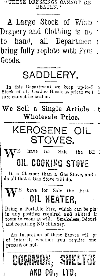 “THESE DRESSINGS CANNOT BE BEATEN." A Large Stock of Wiut< • Drapery and Clothing is no ' to hand, all Departmen s being fully replete with Fm . Goods. SADDLERY. In this Department we keep up-10-c 3 Stock of all Leathe-r Goods at prices we t 1 sure cannot be beaten. We Sell a Single Article t Wholesale Price. I KEROSENE OiL STOVES. have for Salt the BE . OIL CGOKIMG STOVE It is Cheaper than a Gas Stove, and • do all that a Gas Stove will do. w E OIL HEATER, Being a Portable Fire, which can be plain any position required and shifted fr room to room at will. Smokeless, Odourl I and requiring NO chimney. An Inspection of these Stoves will prof interest, whether you require one present or not. mm ; sit! AND 00,, LTD, ! m : e yi