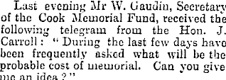 Last evening Mr W. Gaudiu, Secretary of the Cook Memorial Fund, received the following telegram from the Hon. J. Carroll : “ During the last few days have been frequently asked what will be the probable cost of memorial. Can you give me an idea ? ”