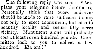 Tho following reply was sent: “ Will plac-e your telegram before Committee. Personally think that every endeavor should be made to raise sufficient money not only to erect monument, but also to beautify locality and secure fifty acres vicinity. Monument alone will probably cost at least seven hundred pounds. Committee look to you to collect a few hundred. Ivia ora I”
