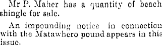 Mr P. Maher has a quantity of beach shingle for sale. An impounding notice in connection with the Matawhero pound appears in this issue.