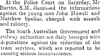 At the Police Court on Saturday, Mr Barton, S.M., dismissed the informations against the young men John Howell and Matthew Spellur, charged with assault and robbery. Tile South Australian Government and railway authorities are daily besieged with d. putations against the reduction of the train services, which arc reported to be causing serious inconvenience.